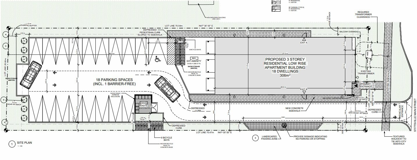 The applicant is proposing to build a three-storey, 18-unit apartment building, which would include 4 studio apartments, 10 one-bedroom apartments and 4 one-bedroom apartments with a den. An outdoor amenity is proposed at the back of the building. A total of 18 parking spaces and 18 bicycle parking spaces are provided and also located at the back of the property. Parking would be accessed from a 3.8-metre access off Stittsville Main. The driveway has been designed with a landscaped passing lay-by so that cars travelling in opposite directions can use the access at the same time.