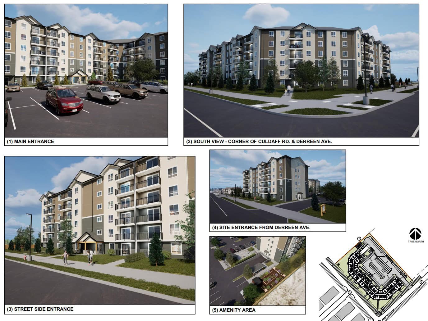 Broadstreet Properties Inc. propose de construire un immeuble d’appartements en forme de U de six étages avec 177 appartements, dont un mélange de studios, d’une chambre, de deux chambres et de trois chambres à coucher. Au total, 212 places de stationnement sont offertes, dont 117 places de stationnement résidentielles et 35 places de stationnement pour les visiteurs, situées à la fois dans un garage de stationnement souterrain et dans un stationnement de surface. Au total, 108 places de stationnement pour bicyclettes sont également aménagées. Le site serait accessible par une promenade le long de l’avenue Derreen.