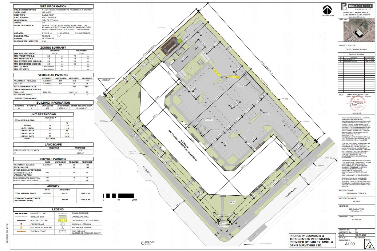 Broadstreet Properties Inc. is proposing to build a six-storey, U-shaped apartment building with 177 apartments, including a mix of studio, one-bedroom, two-bedroom, and three-bedroom units. A total of 212 parking spaces is provided, including 177 residential parking spaces* and 35 visitor parking spaces, located in both an underground parking garage and a surface parking lot. A total of 108 bicycle parking spaces are also provided. The site would be accessed via a driveway along Derreen Avenue.
