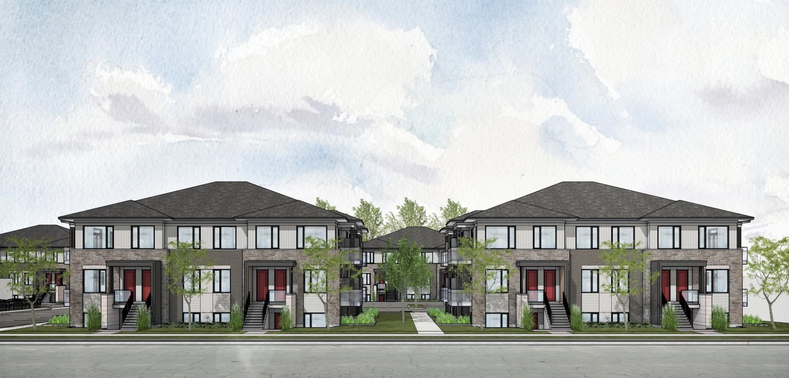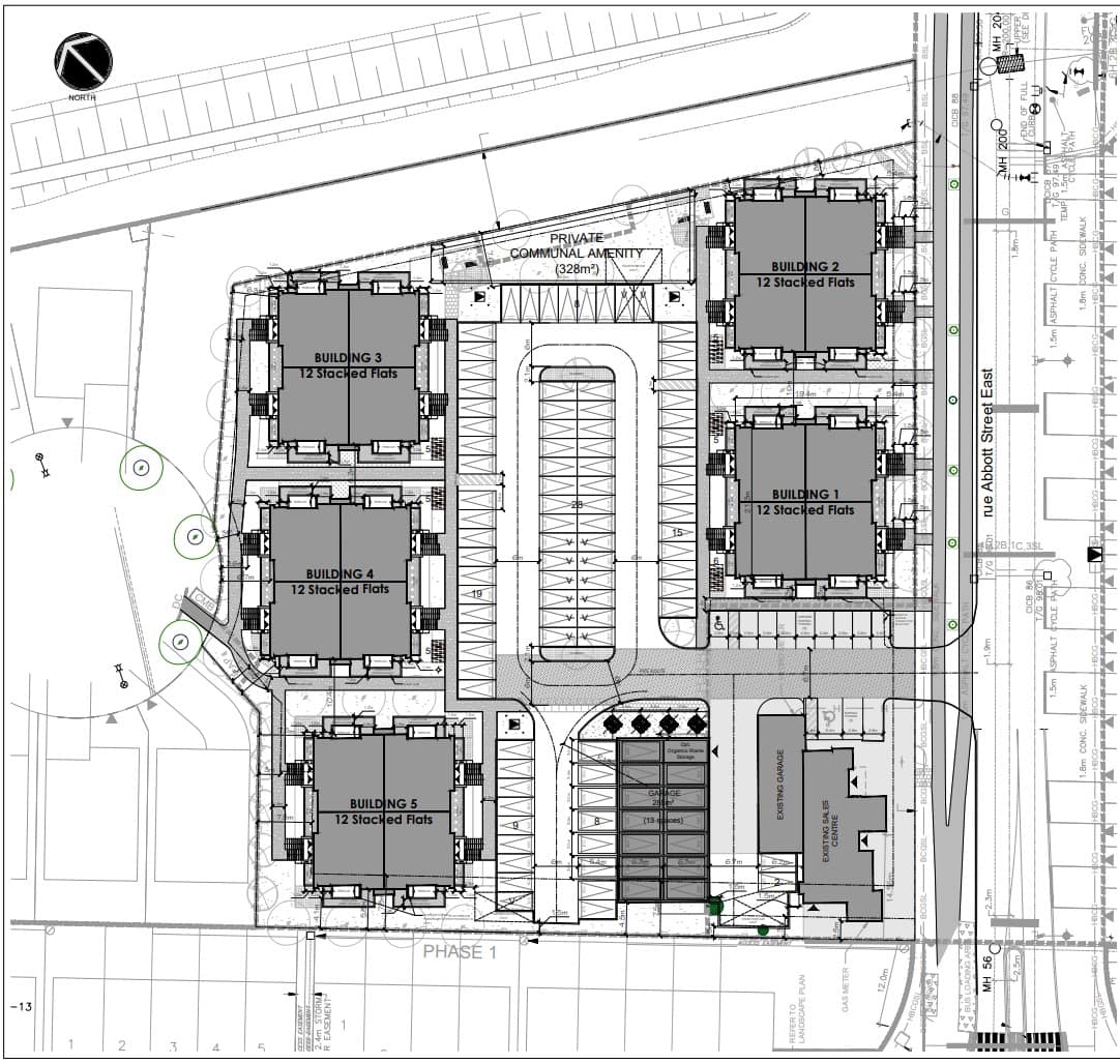 Le projet d’aménagement prévu d’unités de logement comprend cinq immeubles d’appartements superposés de faible hauteur, chacun comportant 12 appartements de deux chambres (soit un total de 60 appartements). Il est proposé de conserver le centre de vente existant et de le convertir en un appartement de deux chambres à coucher et en un bureau de gestion de la location pour l’emplacement. L’aménagement proposé comprend 328 mètres carrés d’aire d’agrément communautaire, ainsi que 114 places de stationnement au total – 87 espaces résidentiels (dont 13 garages), 15 places pour les visiteurs et 12 bureaux. De plus, 31 places de stationnement extérieures pour les vélos sont aménagées et réparties entre les cinq bâtiments. L’accès à l’emplacement est situé sur la rue Abbott Est, en empruntant l’entrée de cour existante où se trouve le centre de vente.