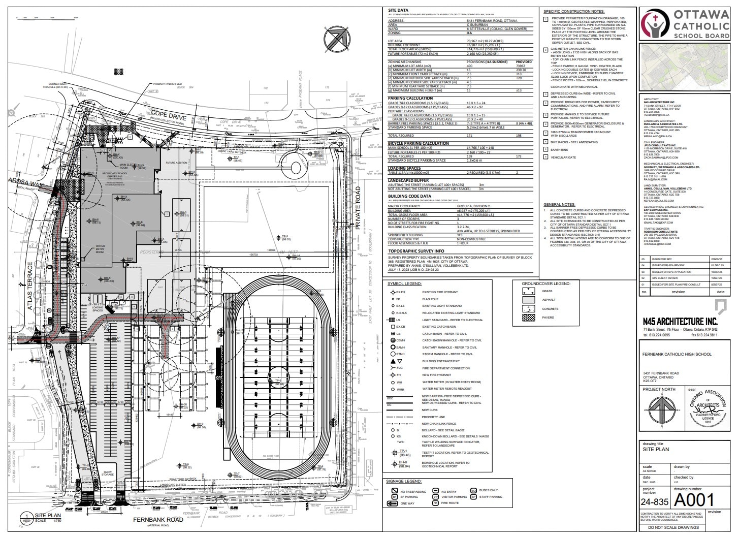 The Ottawa Catholic School Board is proposing to build a three-storey school (grades 7 to 12) with approximately 14,771 square metres of gross floor area. The development also includes two sports fields, an outdoor classroom, a parking lot located south of the school to accommodate 175 parking spaces, a separate drop off area and visitor parking.
