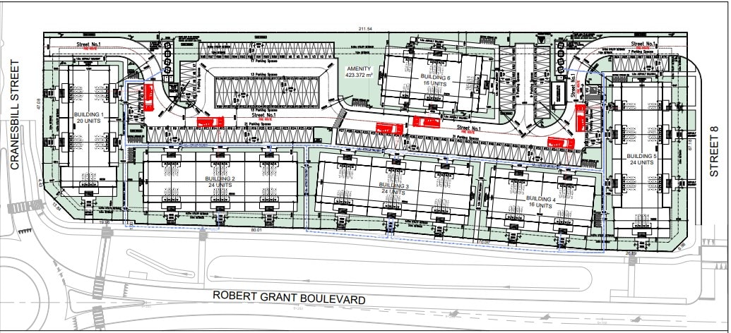 The proposed development will include six back-to-back stacked townhouses with a total of 124 units. Surface parking is provided including 137 spaces. The site is proposed to have two access points via Future Monorail Road and Future Cranesbill Road. Amenity space is provided on site with an area of approximately 430m2.