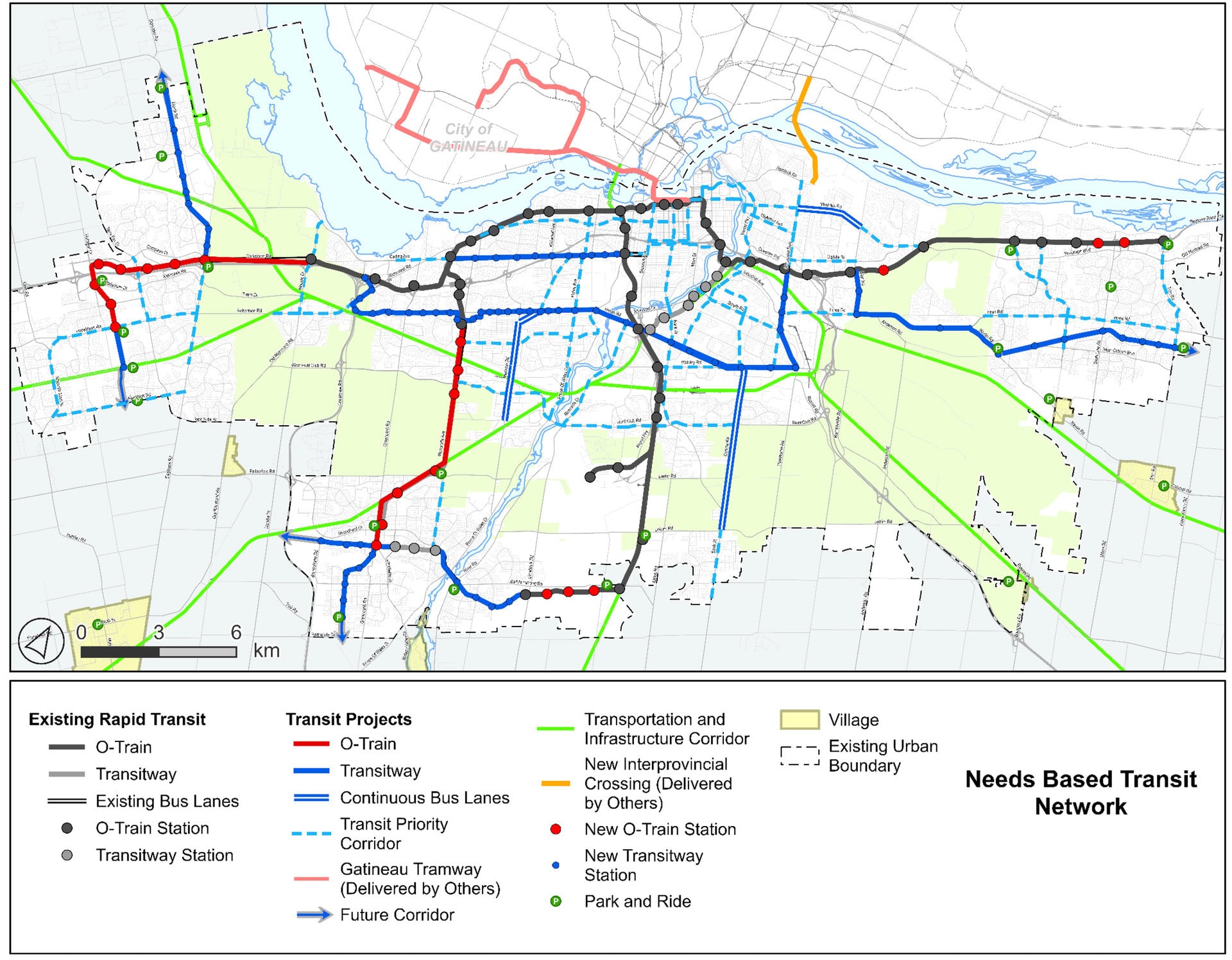 This first map shows the “Needs Based Transit Network”, including major transit projects needed based on population and employment growth projections to 2046. The total capital cost of the projects is $4.9-billion, plus $8.3-billion for the O-Train Stage 3 extensions to Stittsville, Kanata, and Barrhaven. That’s a total of $13.2-billion for transit.
