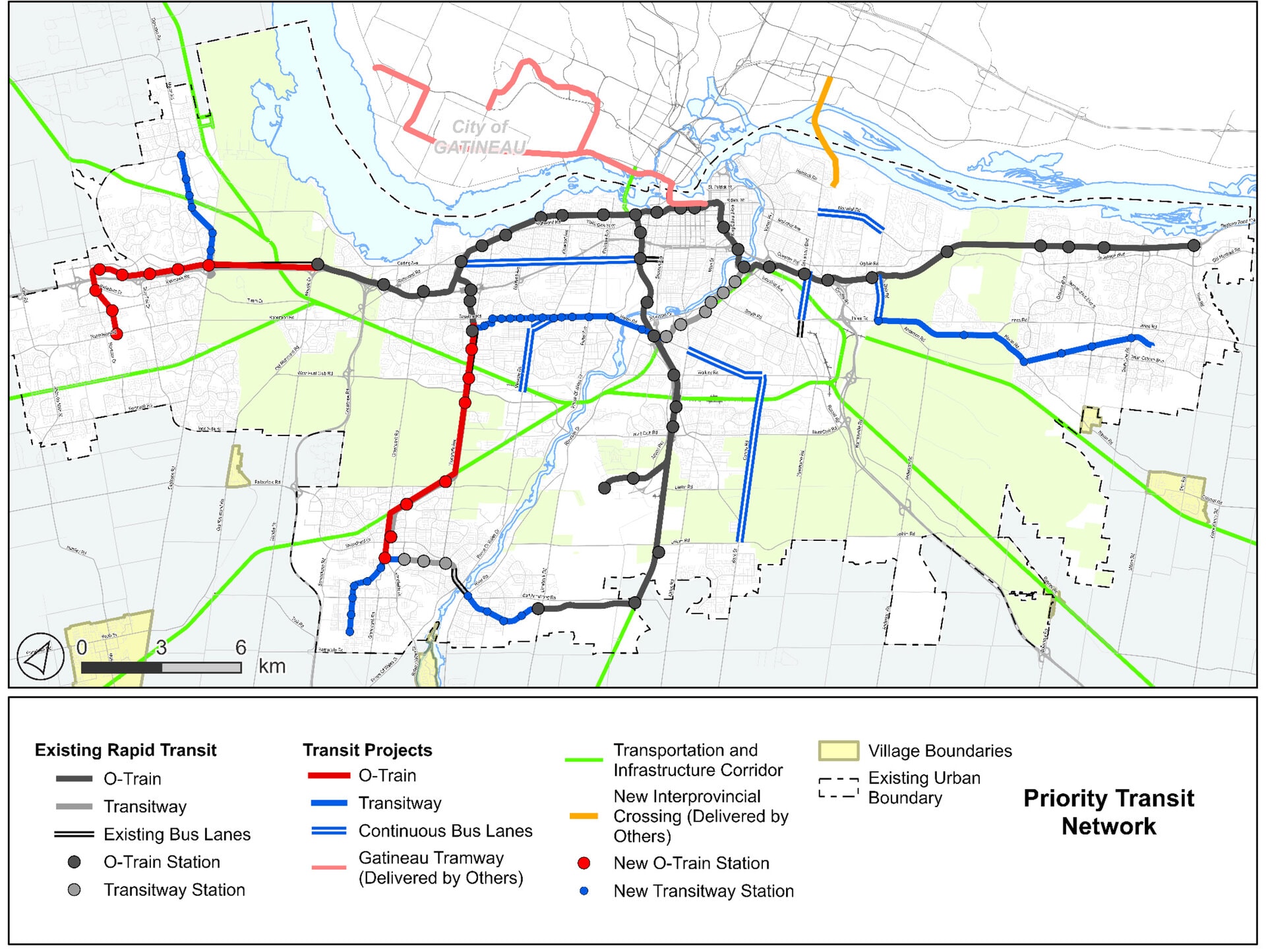 (Remarque : Le TLR allant vers Stittsville, Kanata et Barrhaven est basé sur l’hypothèse que les gouvernements provinciaux et fédéral financeraient la totalité des coûts. Si ce financement n’est pas accordé, il est probable que nous verrons une combinaison du TLR et du Transitway le long de ces corridors.)