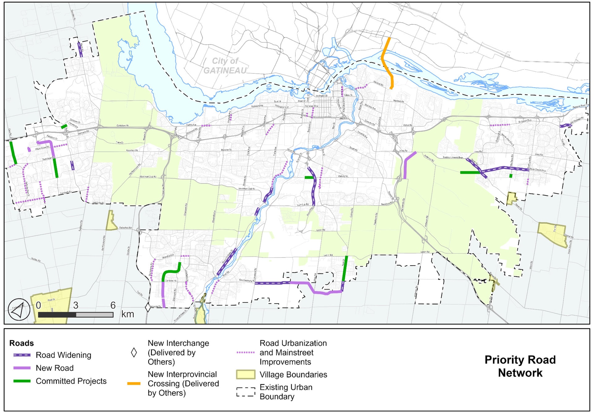 Comme pour les projets de transports en commun, le personnel a créé un « Réseau routier d’après les besoins » et un « Réseau prioritaire » amélioré pour les routes. La plupart des projets prioritaires dans l’ouest se trouvent à Stittsville. Le coût de la construction de tous les réseaux prioritaires à l’échelle de la ville est de 1,1 milliard de dollars.