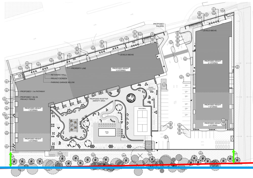 2) Another setback change is due to the irregular property line, that skews from west to east. The blue line shows what a “straight” property line would look like as compared to the existing property line in red. Because the parking garage is square, the eastern corner of the parking garage is slightly closer to the property line compared to the western side, so Scalia has requires a zoning amendment. No portion of the parking garage would be more than 1.8 metres above grade, and not visible from abutting properties due to the landscaping buffer.