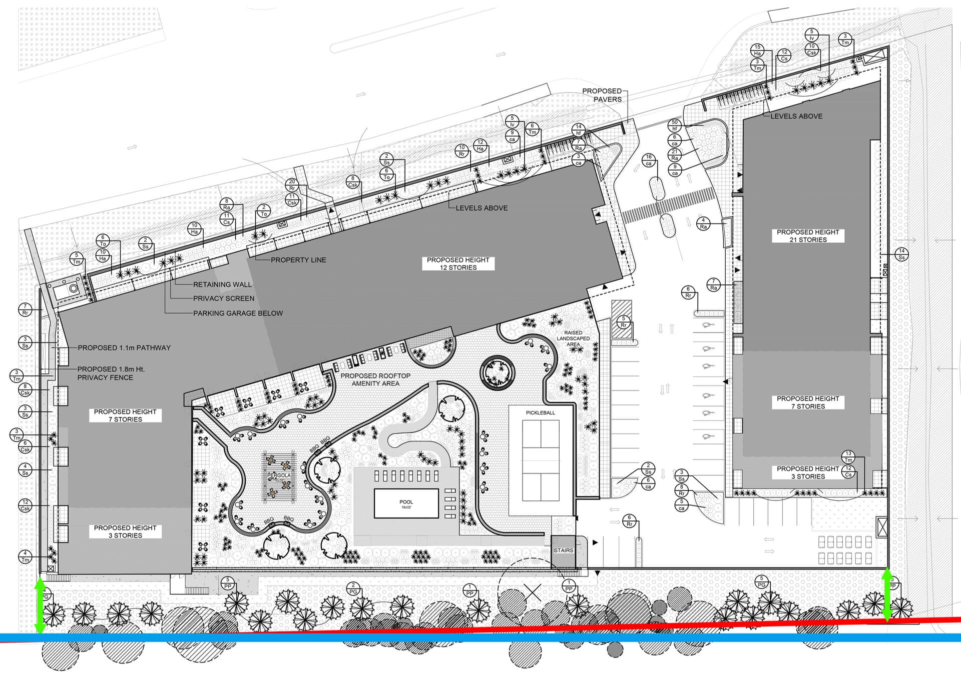 2) Another setback change is due to the irregular property line, that skews from west to east. The blue line shows what a “straight” property line would look like as compared to the existing property line in red. Because the parking garage is square, the eastern corner of the parking garage is slightly closer to the property line compared to the western side, so Scalia has requires a zoning amendment. No portion of the parking garage would be more than 1.8 metres above grade, and not visible from abutting properties due to the landscaping buffer.