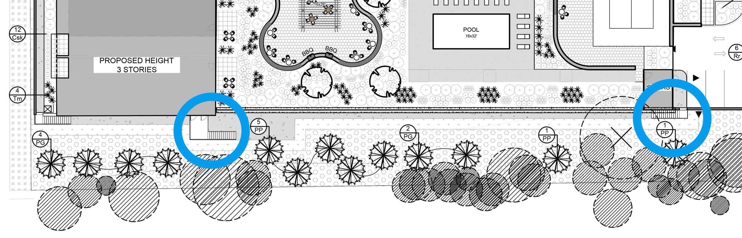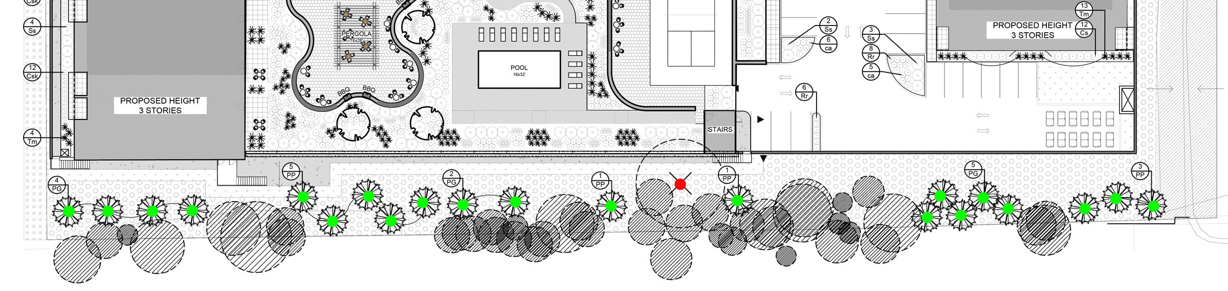An updated landscaping plan shows in more detail the rear buffer zone on the south side of the property. One tree is proposed to be removed, which we’ve marked with a red circle. Twenty-one new trees are proposed to be planted, which we’ve marked with green circles.