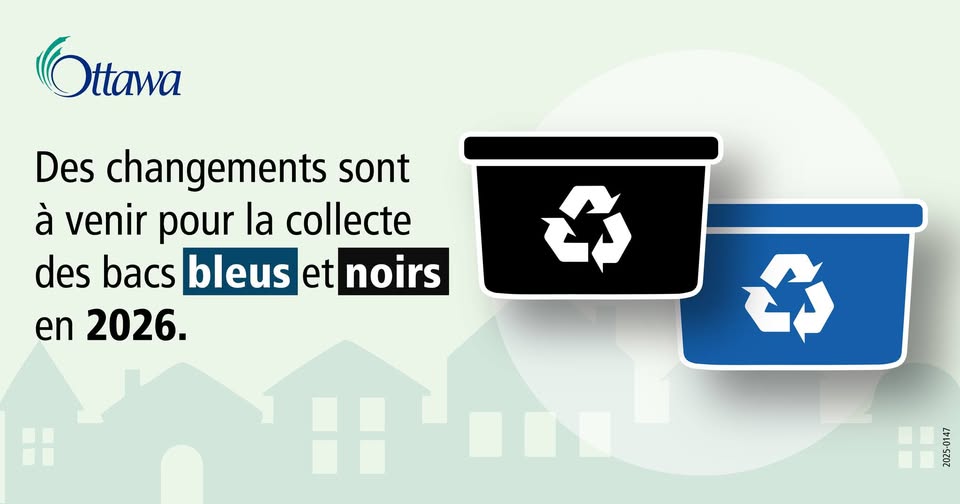 Nous vous rappelons qu’à compter du 1er janvier 2026, le recyclage relèvera du gouvernement provincial. Conformément à la réglementation ontarienne, la responsabilité de la collecte et du traitement des matières recyclables passera à Circular Materials, dont le sous-traitant Miller Waste se chargera de vider vos bacs bleus et noirs.