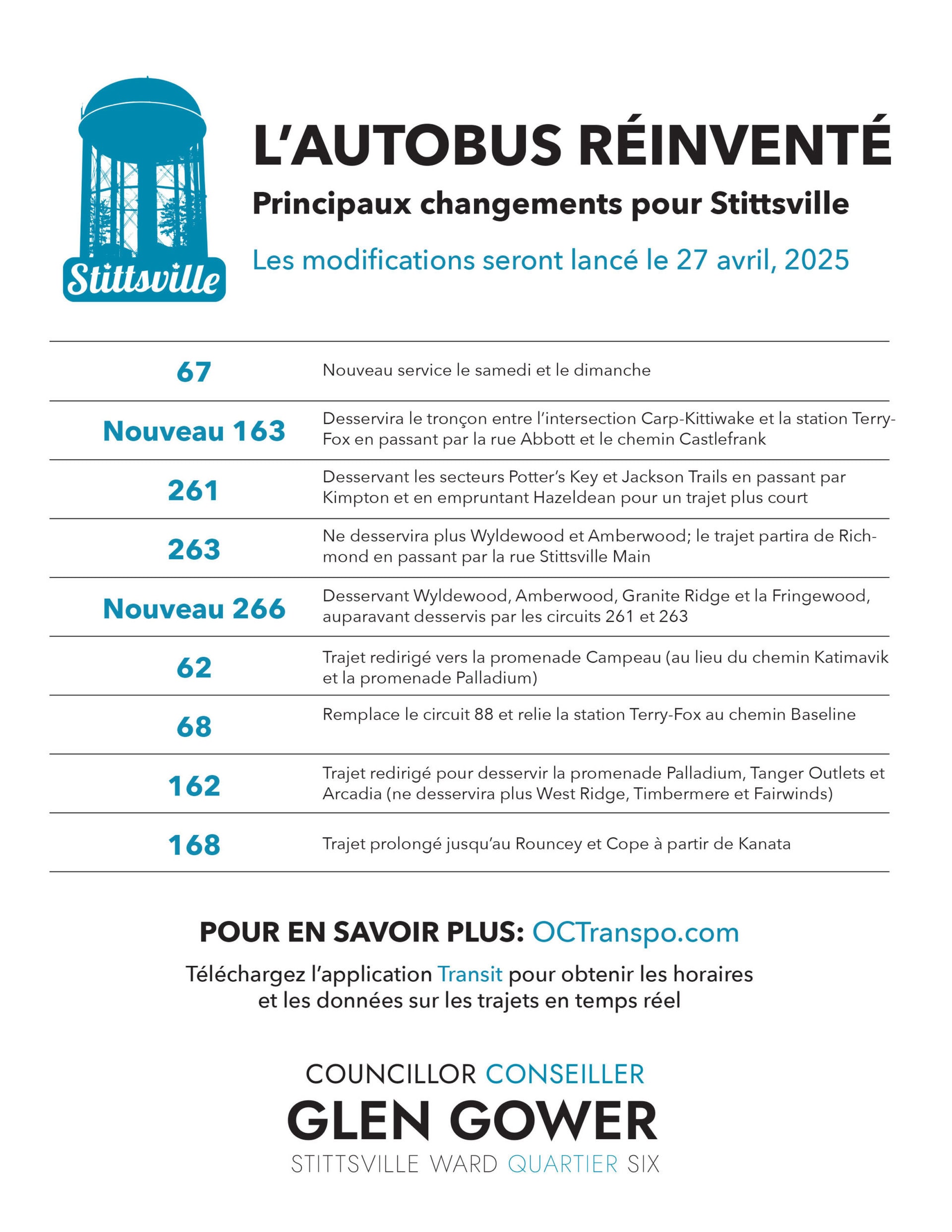 L’initiative L’autobus réinventé d’OC Transpo sera lancé le dimanche 27 avril, et des modifications seront apportées au service et aux circuits dans l’ensemble de la ville. À Stittsville, il y aura différentes heures de service, de nouveaux horaires et de nouveaux circuits. Vous trouverez les principaux changements indiqués ci-dessous. D’autres renseignements, comprenant les horaires et les cartes des circuits, sont publiés à l’adresse OCTranspo.com/fr/.