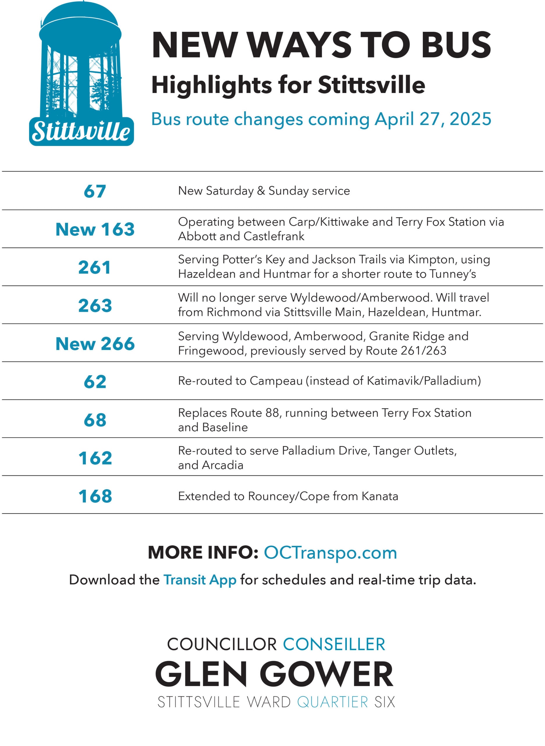 On Sunday, April 27 OC Transpo’s New Ways to Bus service changes launch City-wide and your routes will change. For Stittsville there are different service hours, new schedules, and new routes. We’ve outlined the major changes below. You can find more information, including schedules and route maps at octranspo.com.