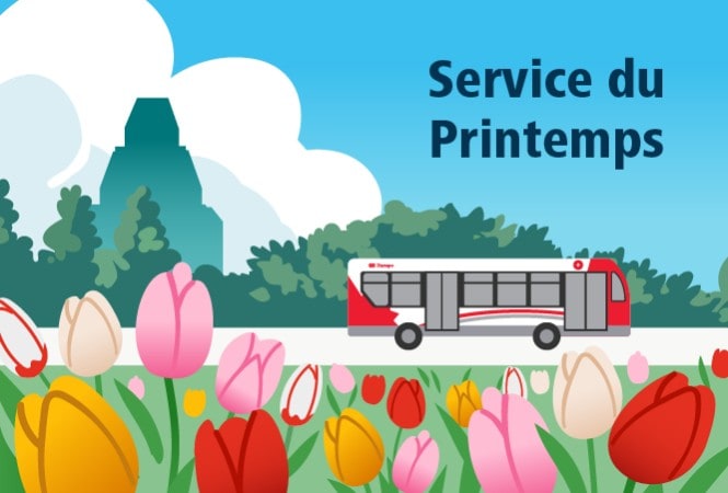 Le service printanier d’OC Transpo commencera le dimanche 19 avril. Il comprendra des ajustements du service d’autobus, des modifications d’horaires saisonnières et des modifications en raison de travaux.