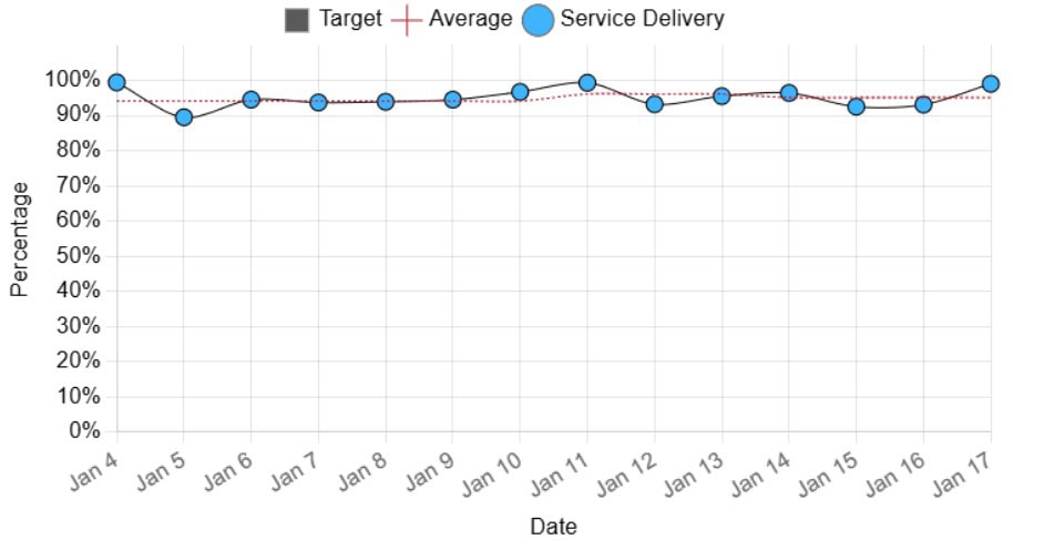 Weekly average service delivery was 95.1%, 4.4% lower than target. When excluding January 14 to January 16 due to severe winter weather, bus service delivery was 96.1%.