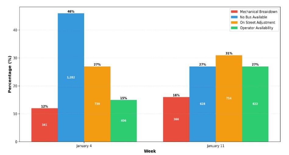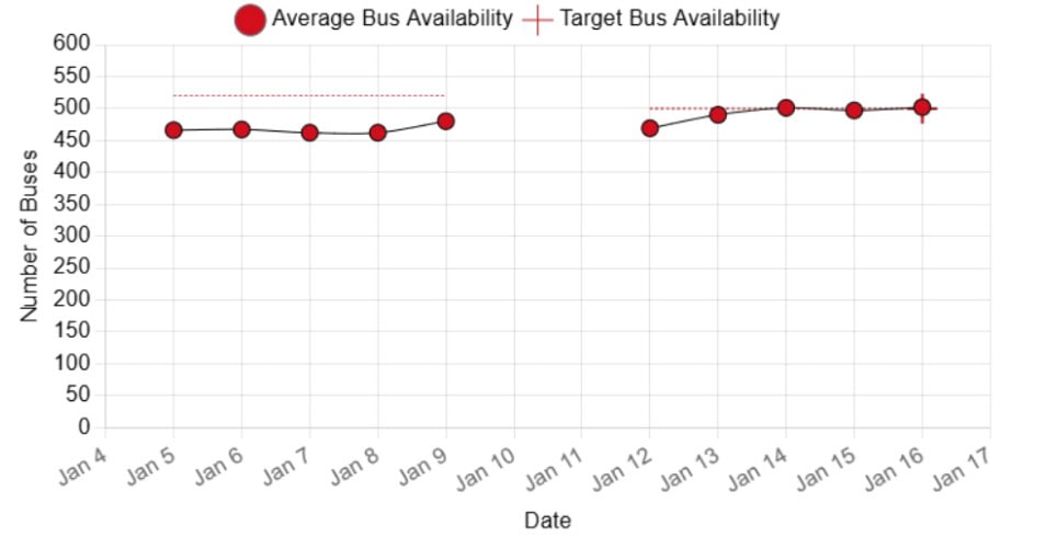 The week of January 11 to January 17 saw an overall improvement in the number of buses available for service and a decrease in cancelled trips. While this is a positive improvement, work continues to ensure we can consistently deliver the service customers expect.