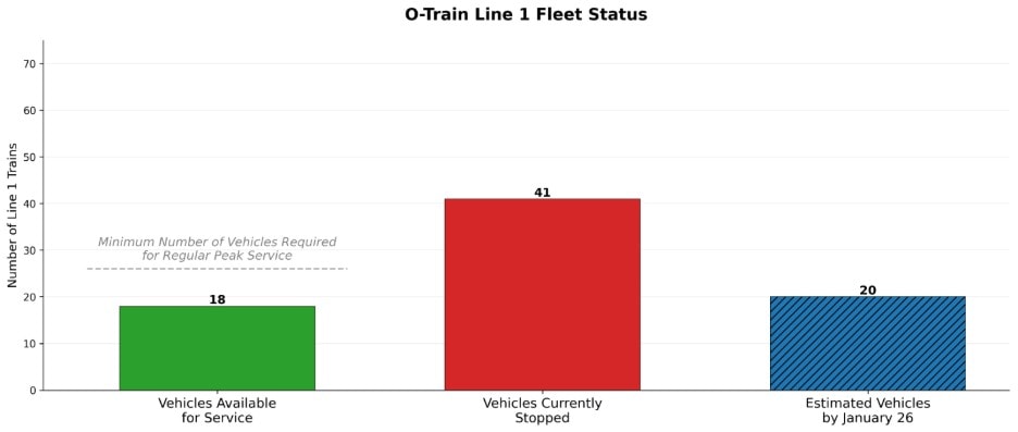We continue to work with RTG to confirm vehicle availability for next week. Based on the current information available, it is estimated that 20 vehicles will be available for service on Monday, January 26. This situation remains fluid, and we are working with RTG on long-term fleet management plans. OC Transpo is monitoring the transit system closely and is in regular contact with RTG to be ready to integrate additional vehicles into service as soon as possible.