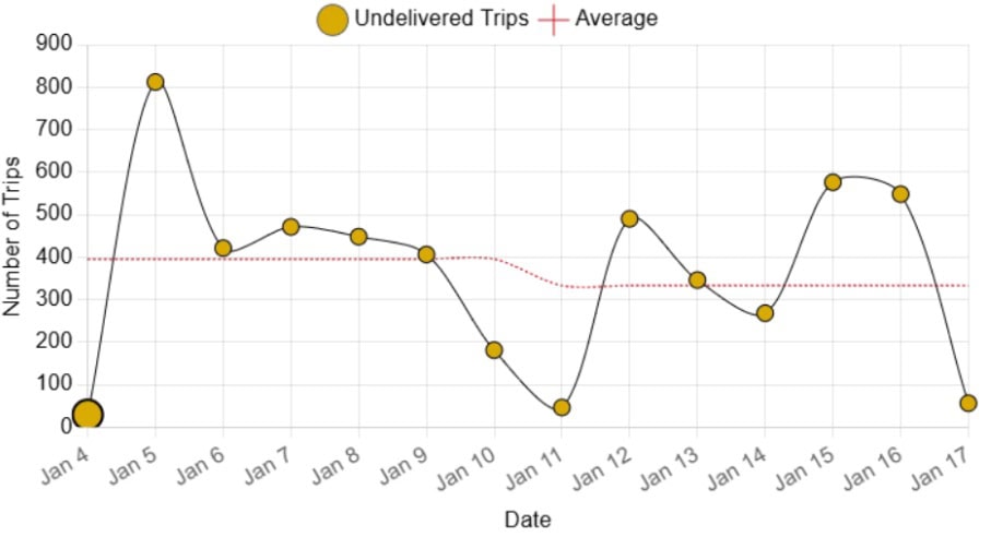 Of the 2,330 trips undelivered, the above chart shows the top reasons a trip could not be delivered. The numbers in the column are the actual trips canceled. The following reasons are possible: