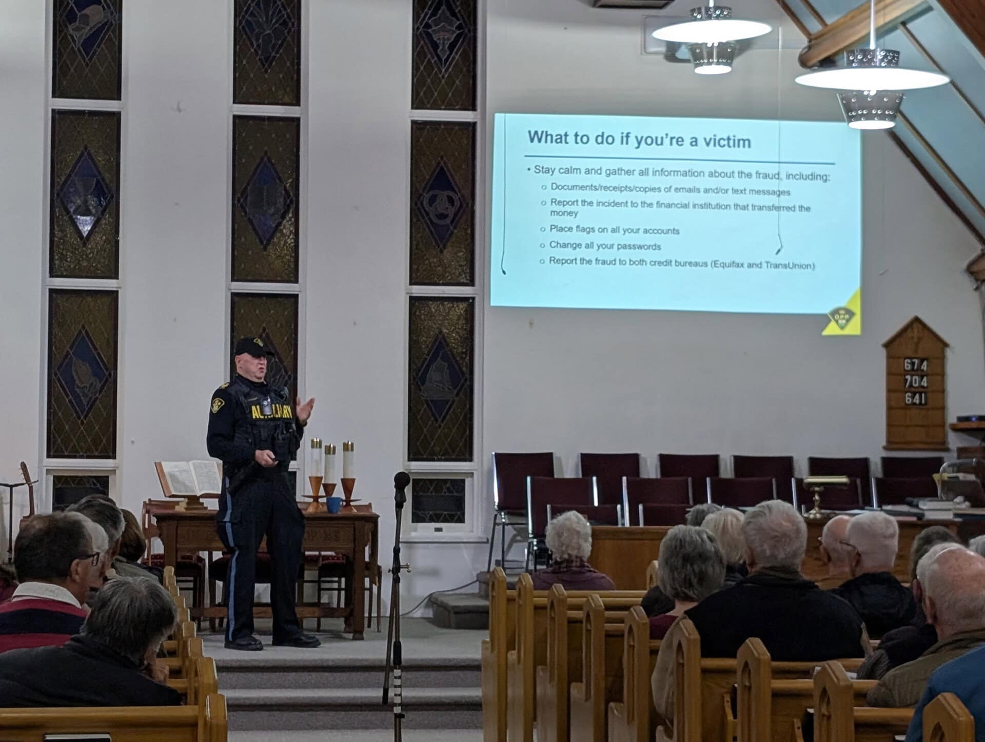 A special thank you to Staff Sgt. Chris Sturgeon from the Ontario Provincial Police for sharing practical tips and strategies to help safeguard your finances and personal information at our recent anti-fraud workshop. Thank you to residents who joined us to learn more about protecting yourself from fraud and scams. Thanks also to Reverend Doug Kendall at St. Andrew’s Church for hosting us.