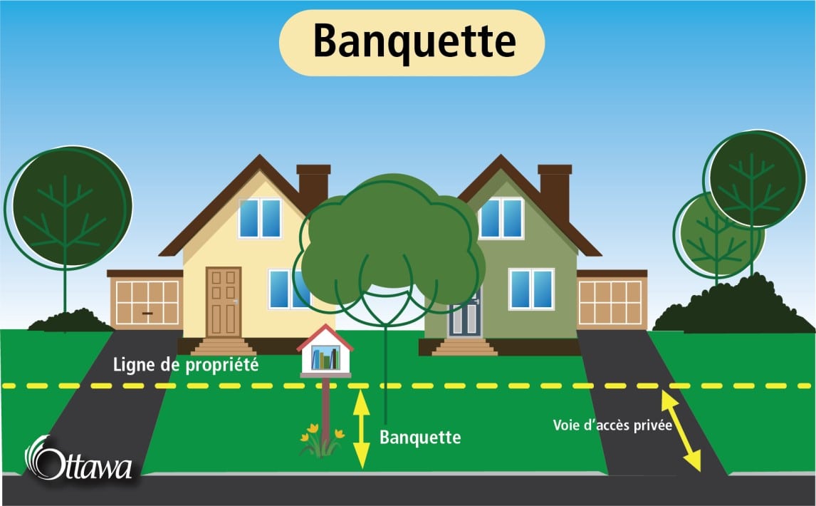 La taille et les dimensions des banquettes varient d’un quartier à l’autre. Le programme geoOttawa de la Ville peut constituer un guide utile pour savoir où se trouve le périmètre approximatif de l’emprise de la Ville et votre propriété.