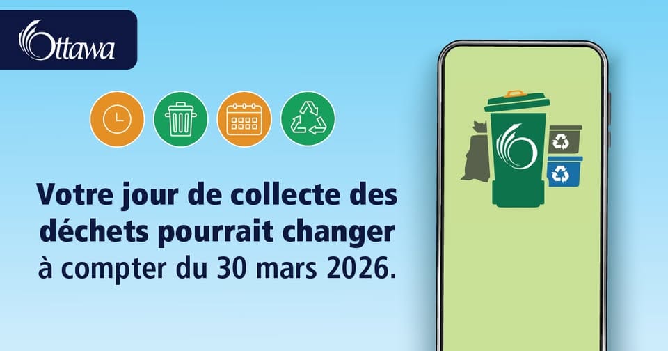 À compter du lundi 30 mars, il est possible que votre jour de collecte des déchets change en raison du nouveau contrat de collecte des déchets en bordure de rue de la Ville. Les jours de collecte seront maintenus pour tous vos déchets, y compris les ordures ménagères, les matières organiques, les feuilles et résidus de jardinage et le recyclage, sauf pour environ la moitié des ménages d’Ottawa, qui se verront attribuer un nouveau jour de collecte.