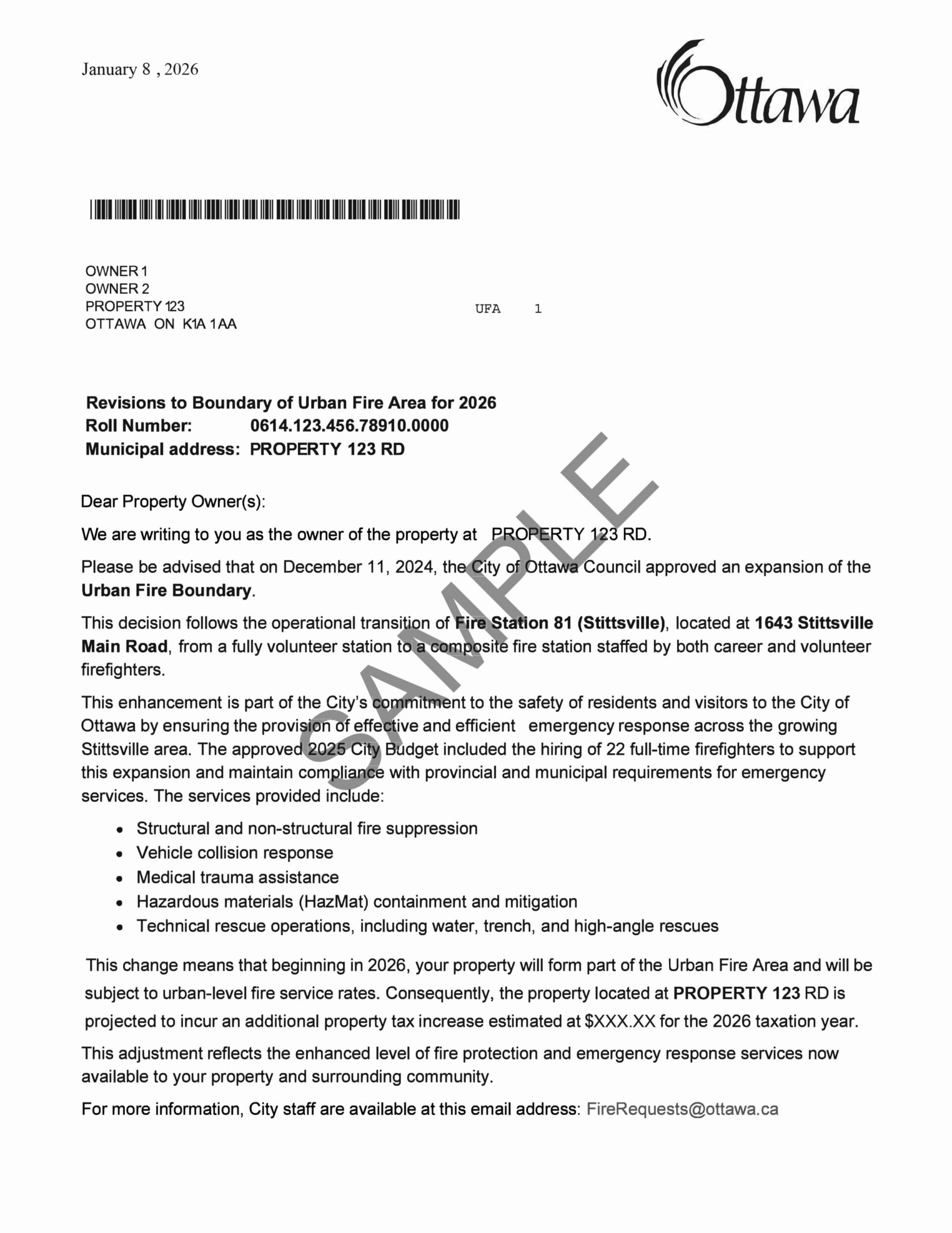 About 5,000 property owners in Stittsville received letters this month with information about an increase to taxes due to revisions of the “Urban Fire Boundary”. A sample of the letter is included below.
