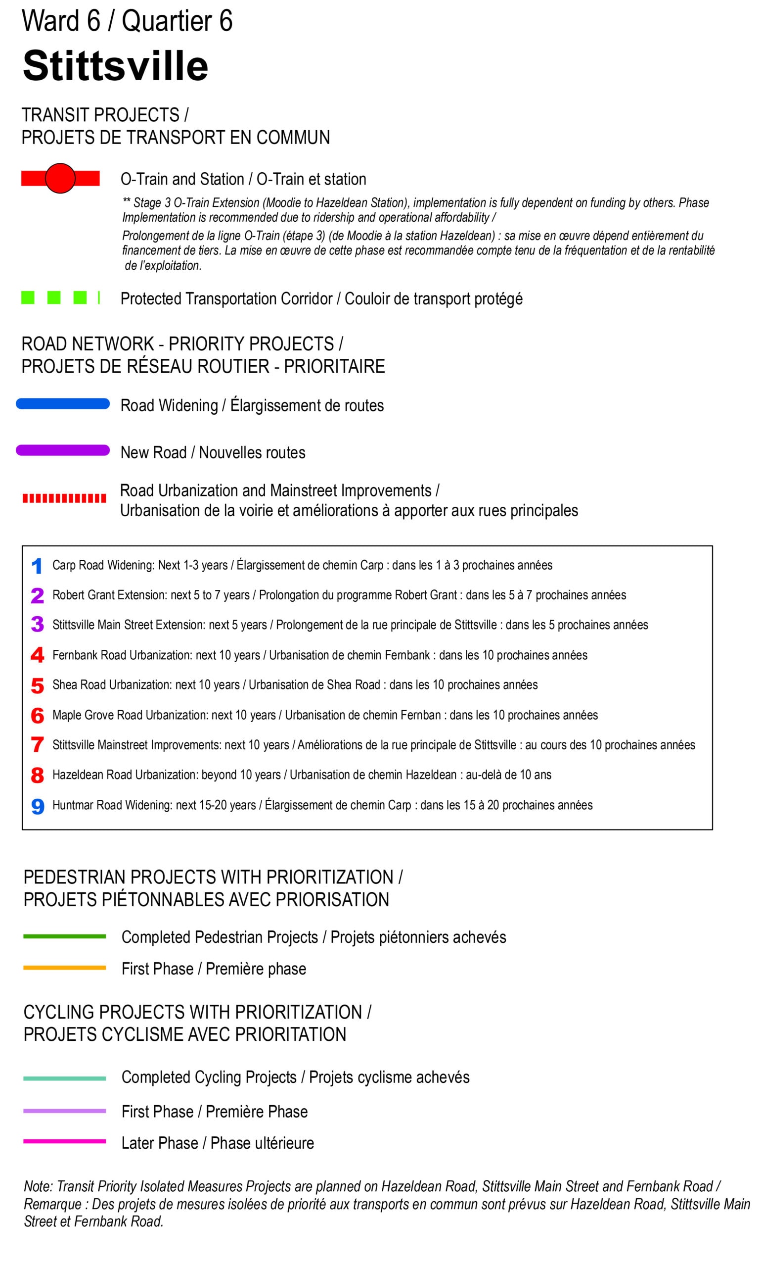 I asked City staff to put together a map that shows all of the Stittsville projects in the TMP. You can click on the map or the legend to enlarge, and we’ve included descriptions of each project below.
