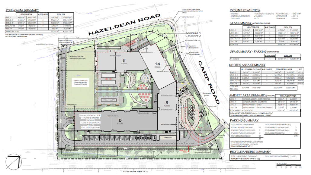 La Ville d’Ottawa a reçu une demande de modification du Règlement de zonage pour une maison de retraite de 14 étages située au 1174, chemin Carp. L’aménagement proposé inclut 413 appartements, avec un mélange de stationnement souterrain et de surface, ainsi qu’un nouveau parc public.