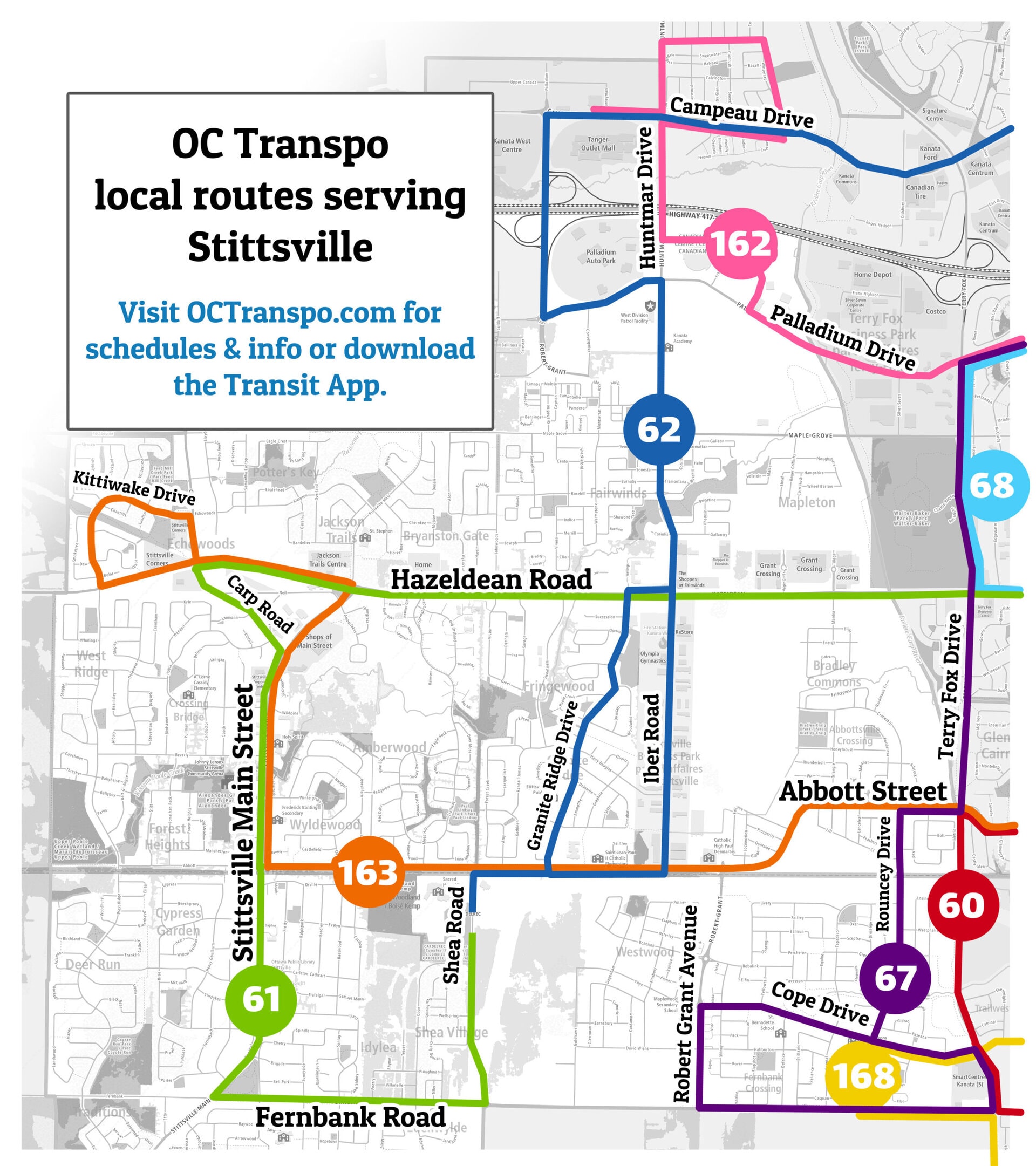 Lorsqu’OC Transpo a lancé le réseau de circuits « L’autobus réinventé » en avril, l’un des principaux changements pour Stittsville a été la mise en place d’un nouveau réseau de circuits locaux. Ces nouveaux circuits et les trajets révisés des autres autobus qui desservent Stittsville faciliteront les déplacements des résidents au sein de la communauté.
