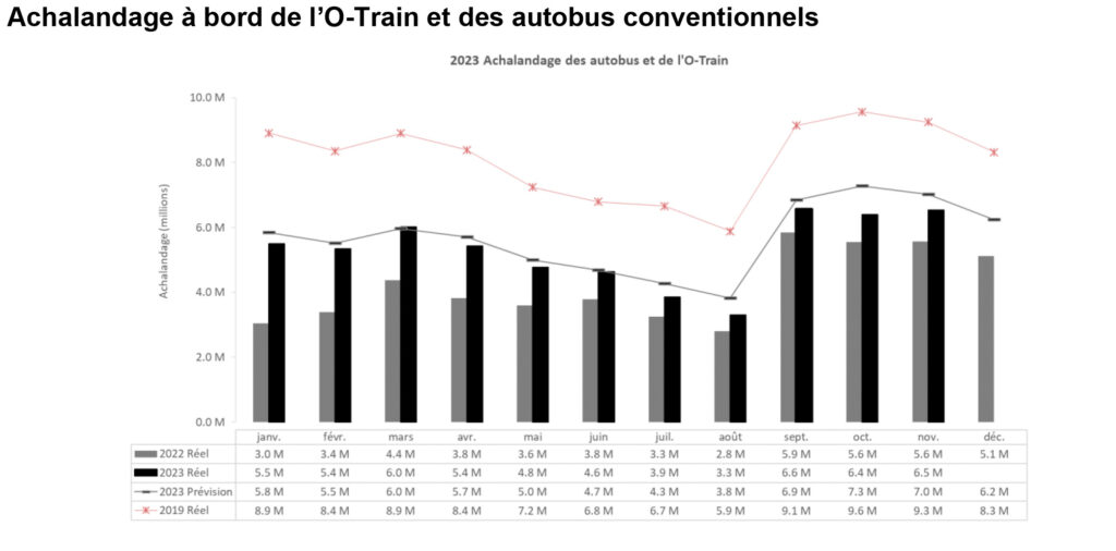 L’achalandage en novembre 2023 représentait 6,5 millions de déplacements d’usagers, soit une augmentation de 17,4 % par rapport à novembre 2022 et une augmentation de 1,6 % par rapport à octobre 2023. L’achalandage pour la période de 12 mois se terminant en novembre 2023 a été en hausse de 1,6 % par rapport à la période de 12 mois se terminant un mois plus tôt, avec 63,5 millions de déplacements.