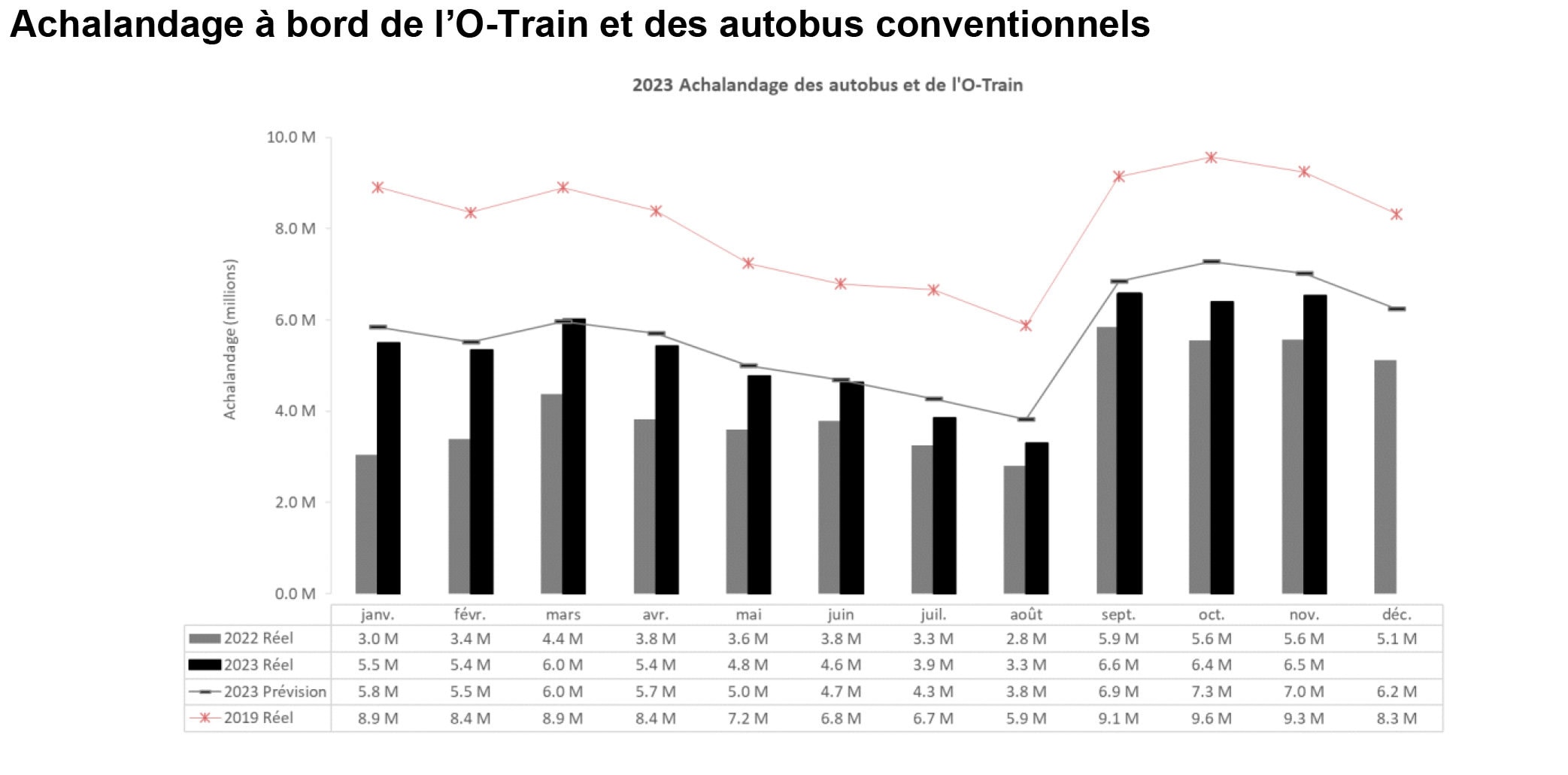 La présente note de service a pour but de fournir aux membres du Conseil et à la Commission du transport en commun les données sur l’achalandage en novembre 2023 relatives aux services d’autobus conventionnels et de l’O-Train.