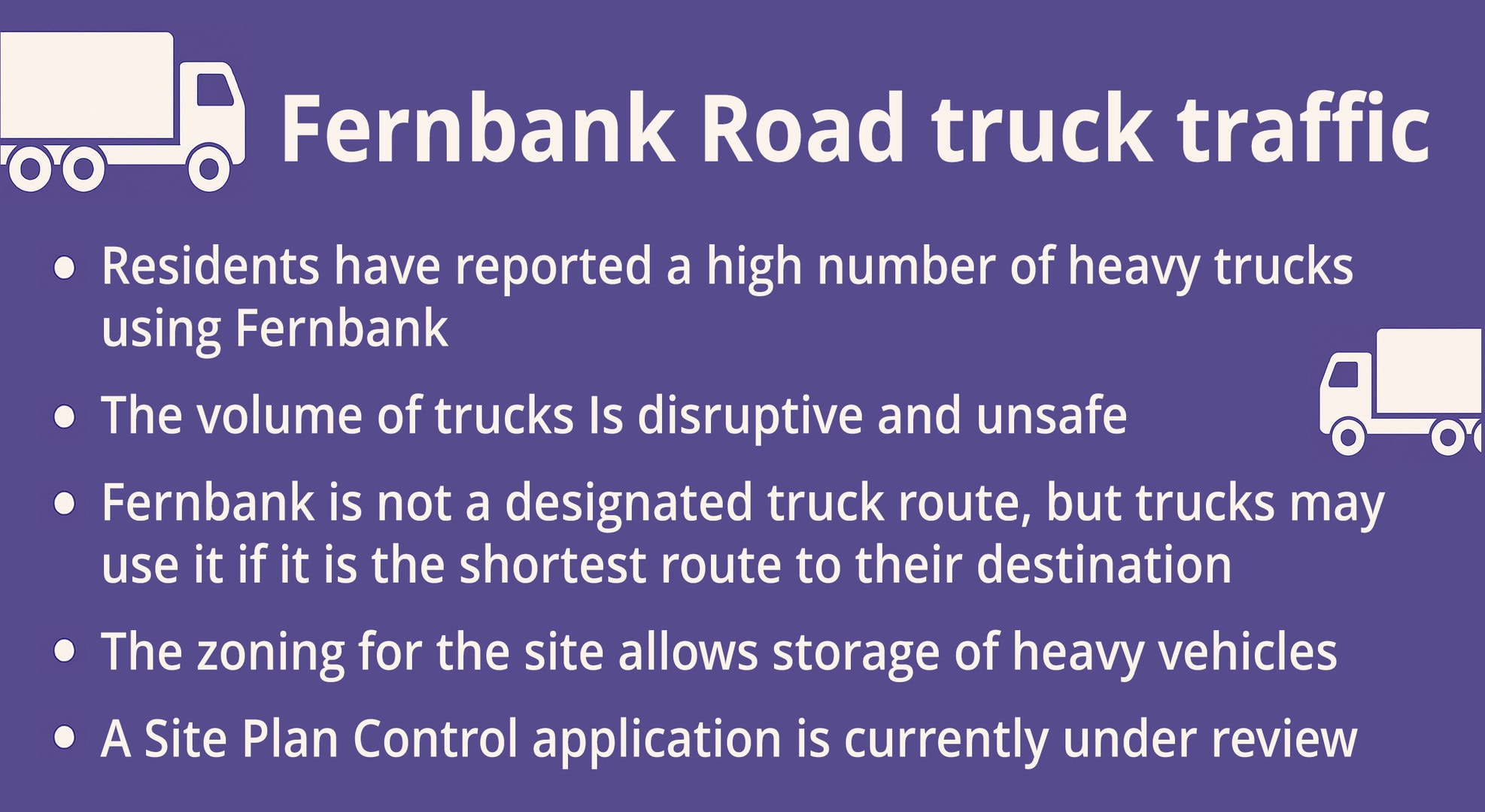 The owners of the property at 6591 Fernbank have submitted a Site Plan Control application to address issues identified by staff. As part of that review, city staff will review access for vehicles and requirements for road modifications. It is unclear how this may affect trucks that are accessing the site. The application is still under review as of September 2025.
